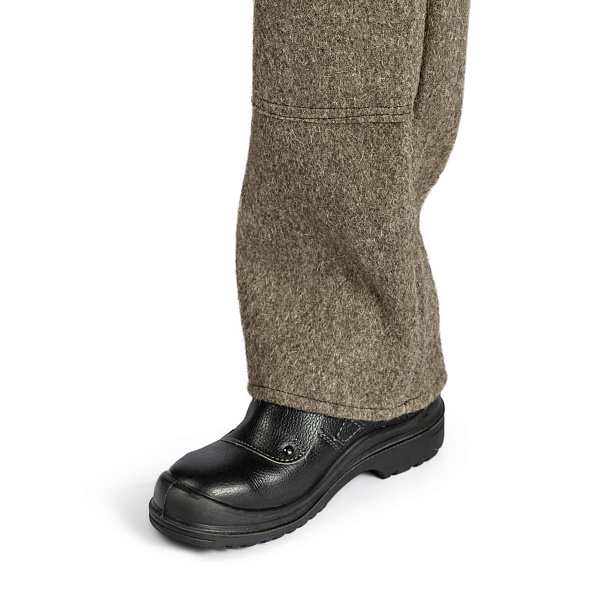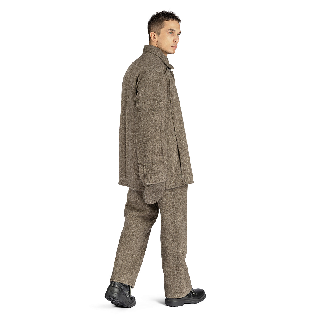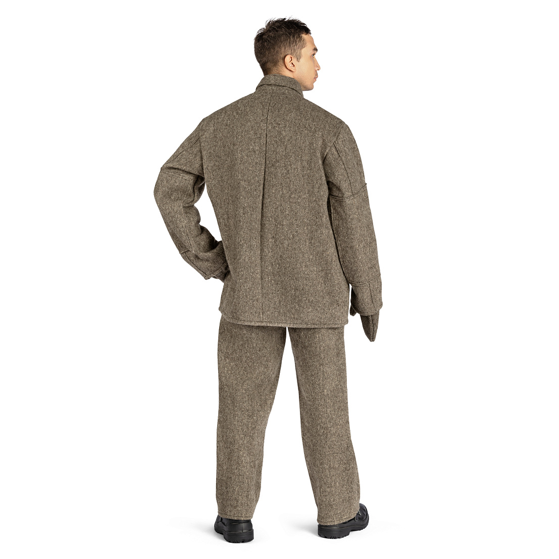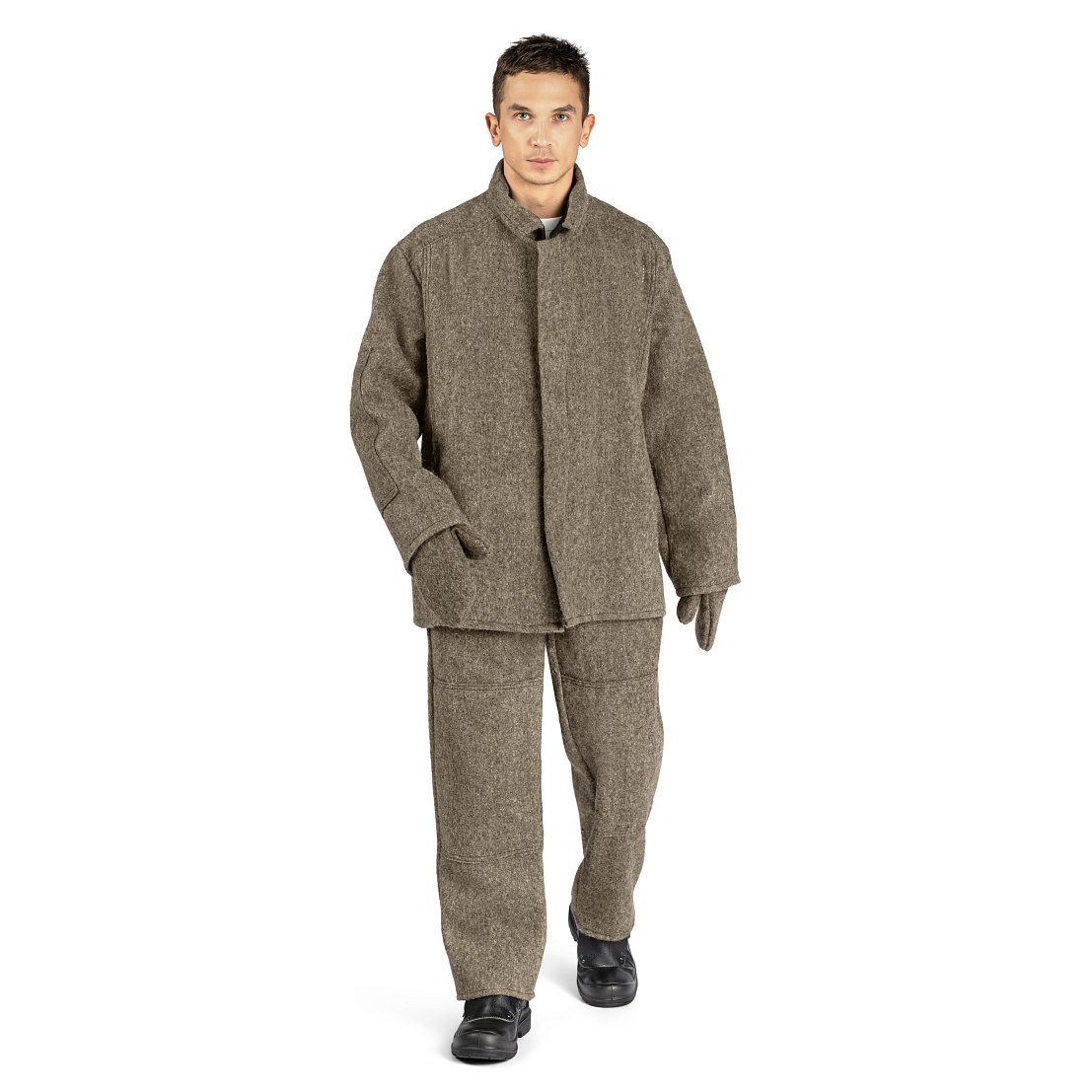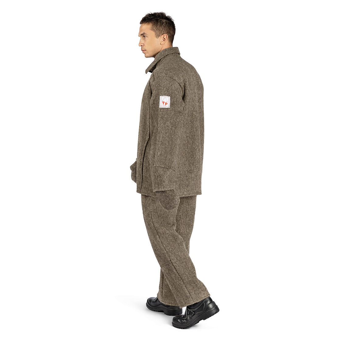 Костюм изготовлен из сукна с огнезащитной пропиткой и разработан с учетом особенностей работы металлургов в условиях горячих цехов.