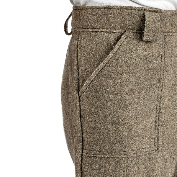 Брюки застегиваются на пуговицы. Два боковых кармана расположены в швах брюк.