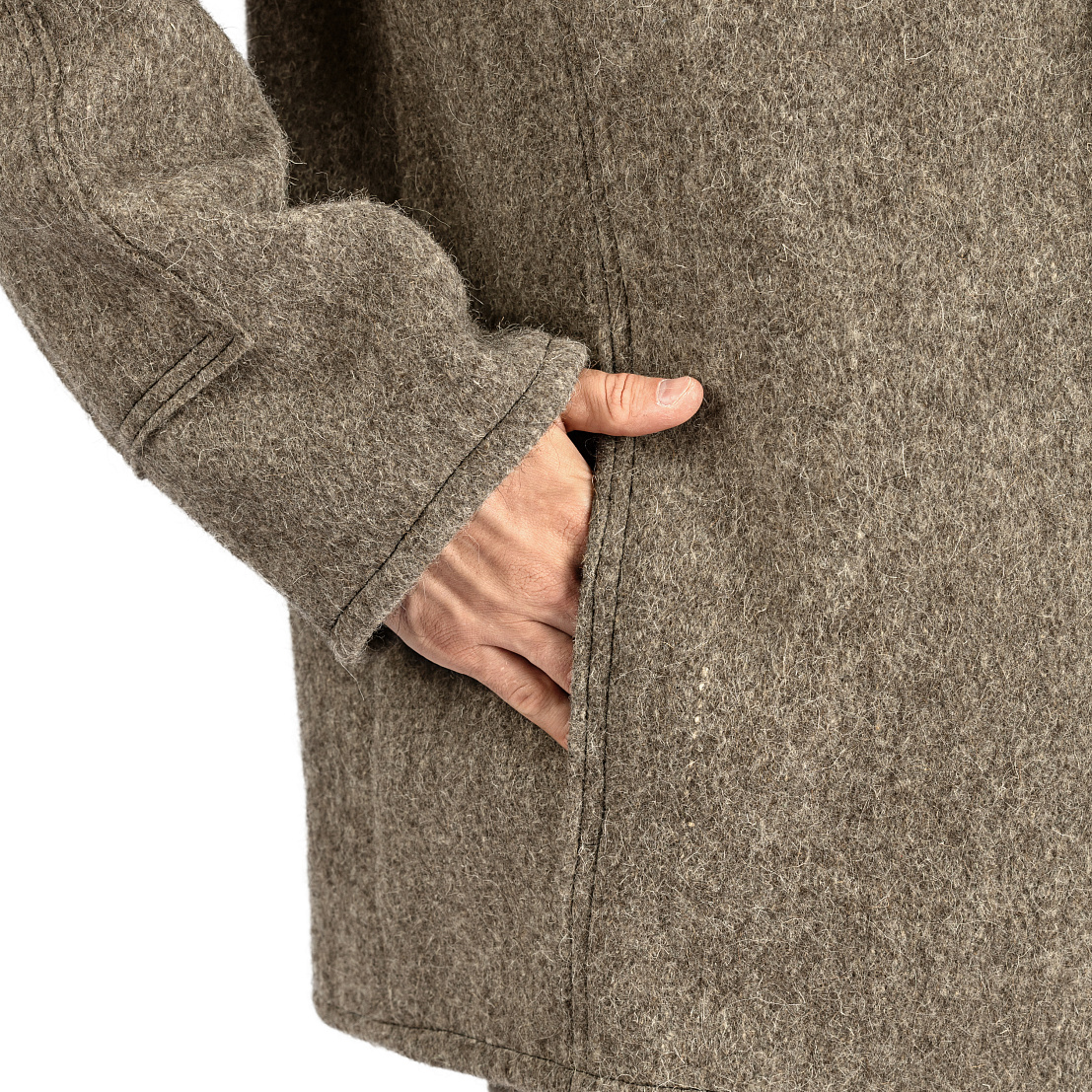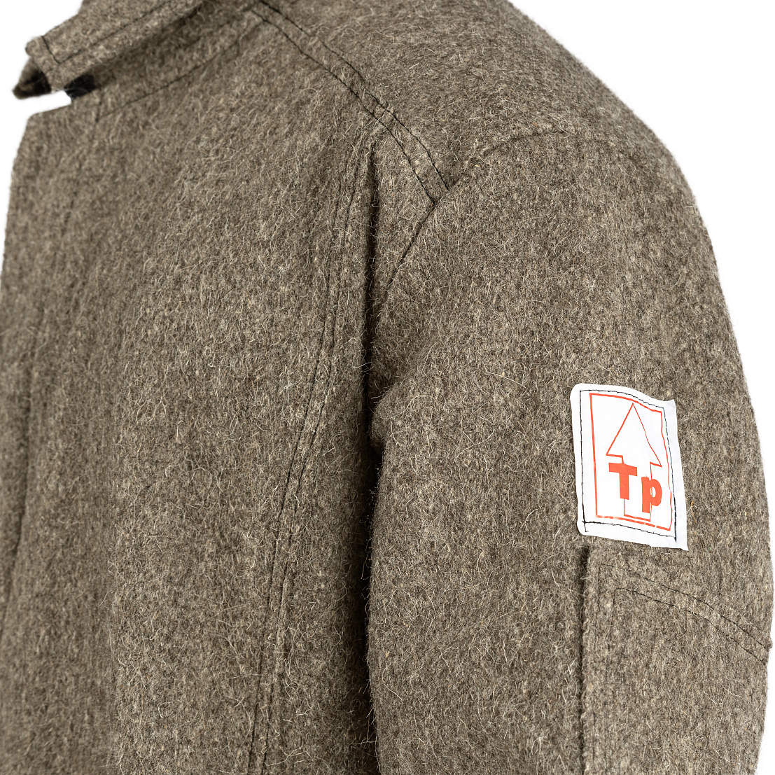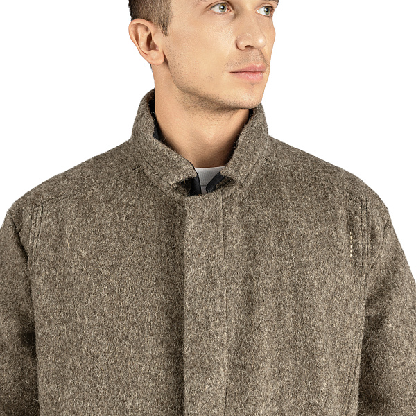 Куртка прямого силуэта с центральной потайной застежкой на пуговицы. Воротник имеет подкладку из бязи. Карманы куртки располагаются в боковых швах.