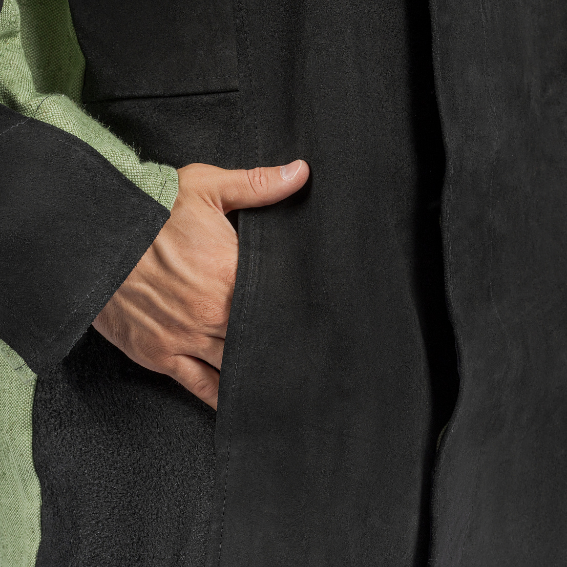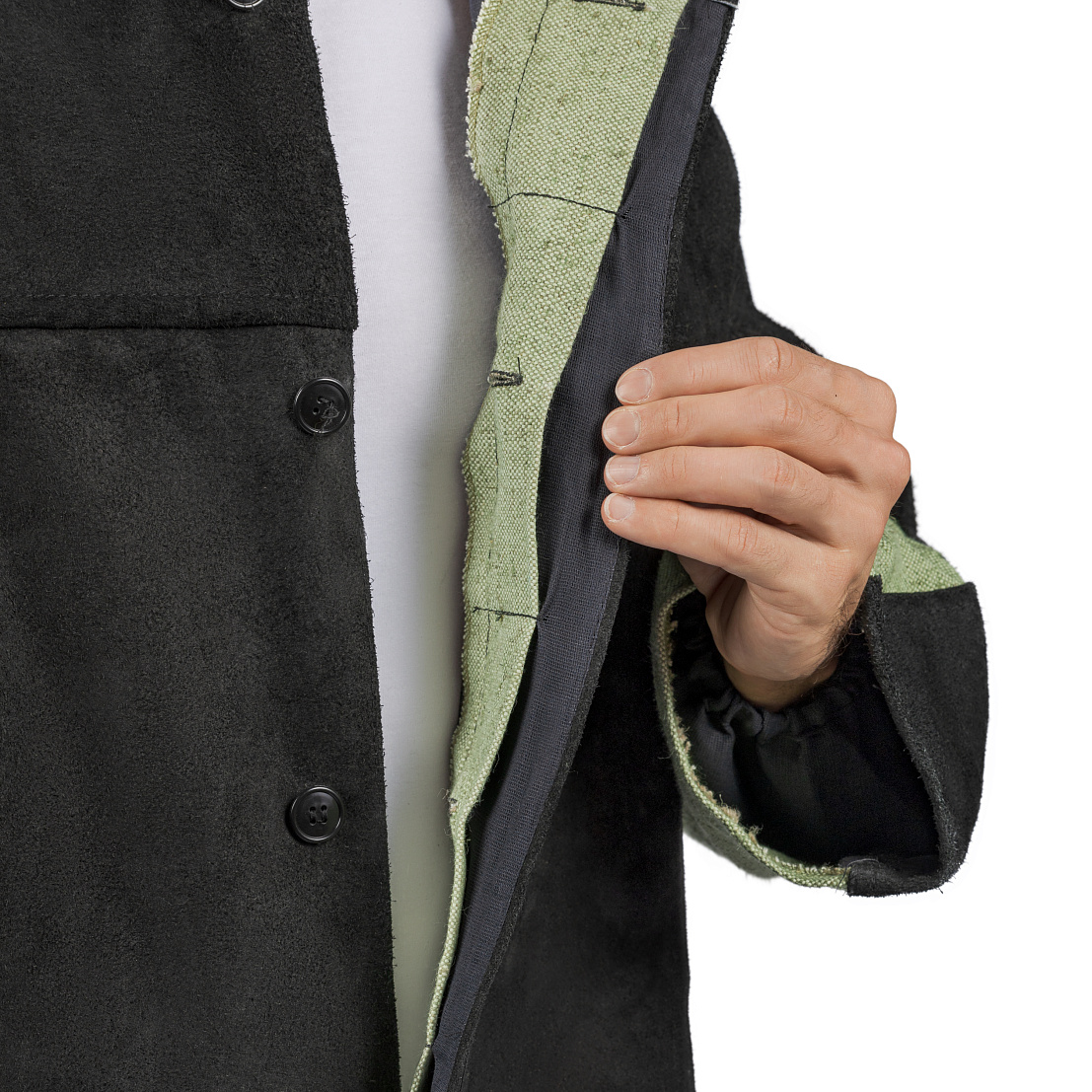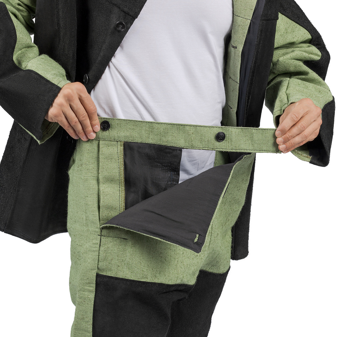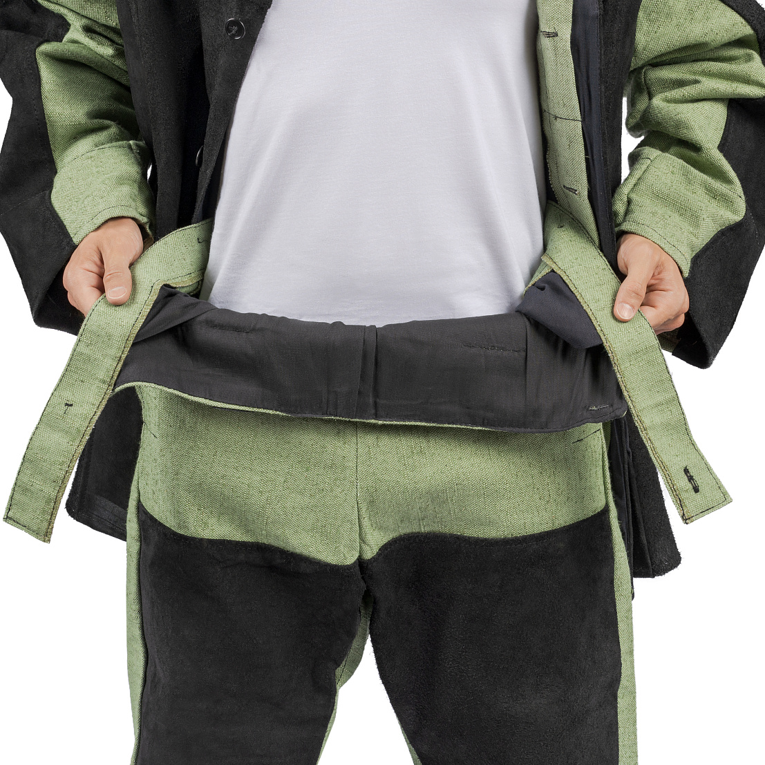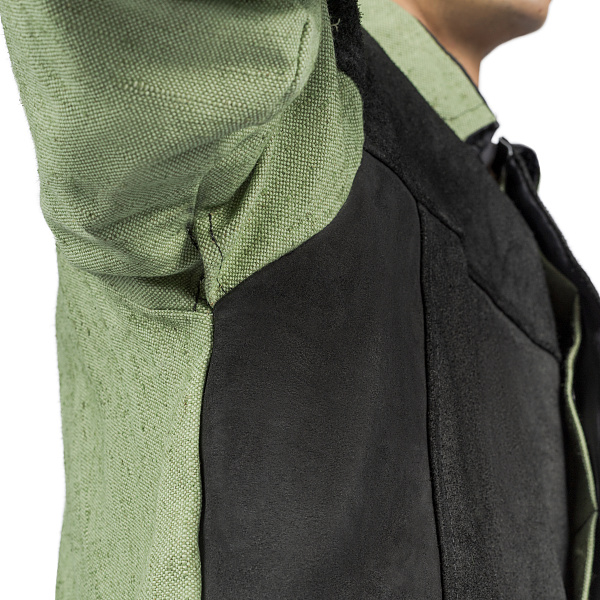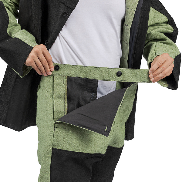 Усиленные накладки из спилка располагаются по передней и задней части кокетки, на полочки, в верхней части рукавов, по передней половинки брюк ниже шагового шва.