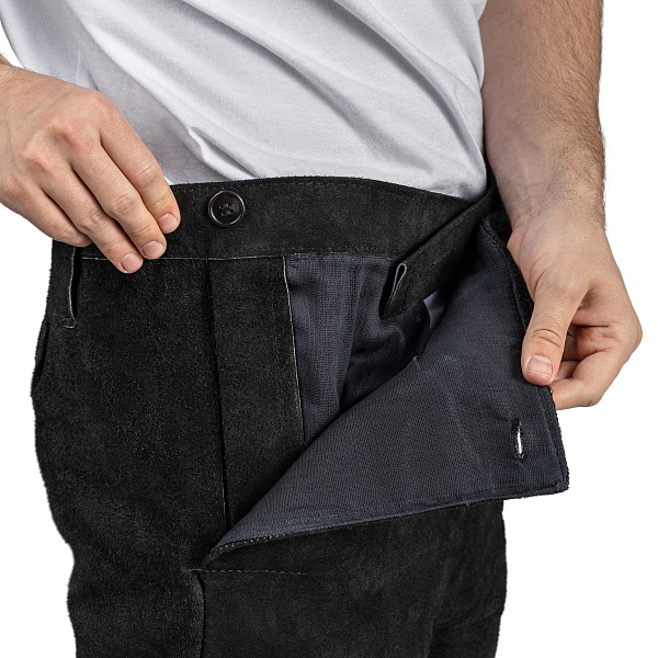 Брюки свободного прямого покроя с откидывающейся передней частью и застёжкой в боковых швах, с внутренними боковыми карманами.
