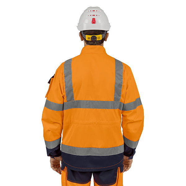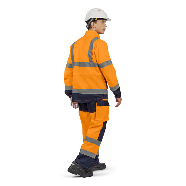 Куртка прямого силуэта, воротником стойкой. Центральная застёжка-молния закрыта с внешней стороны планкой, застегивающейся на текстильную застежку. На спинке куртки расположены вентиляционные отверстия для максимально комфортной работы летом. Световозвращающие полосы расположены на полочке, спинке и рукавах куртки, а также по низу брюк обеспечивают повышенную видимость работника.