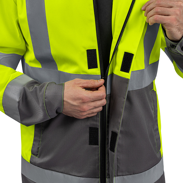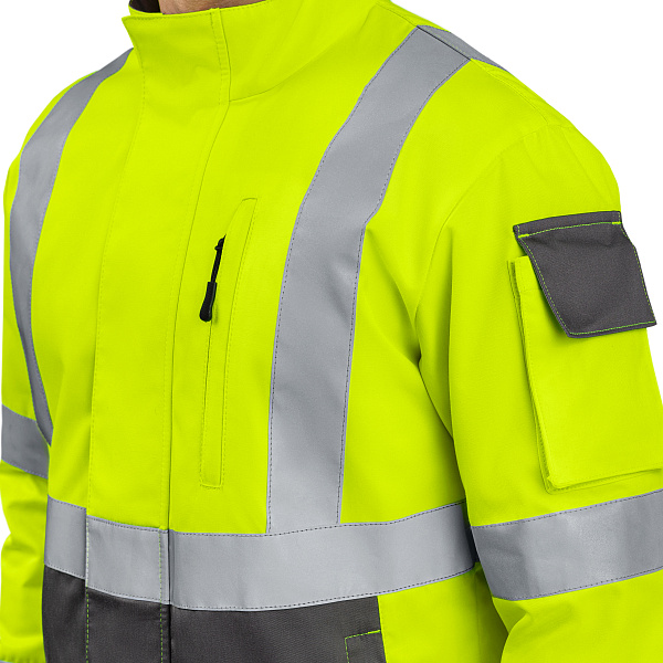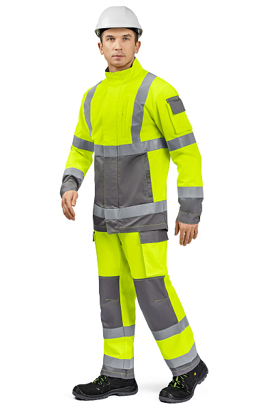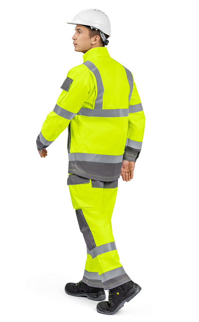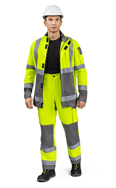 Куртка прямого силуэта, воротником стойкой. Центральная застёжка-молния закрыта с внешней стороны планкой, застегивающейся на текстильную застежку. На спинке куртки расположены вентиляционные отверстия для максимально комфортной работы летом. Световозвращающие полосы расположены на полочке, спинке и рукавах куртки, а также по низу брюк обеспечивают повышенную видимость работника.