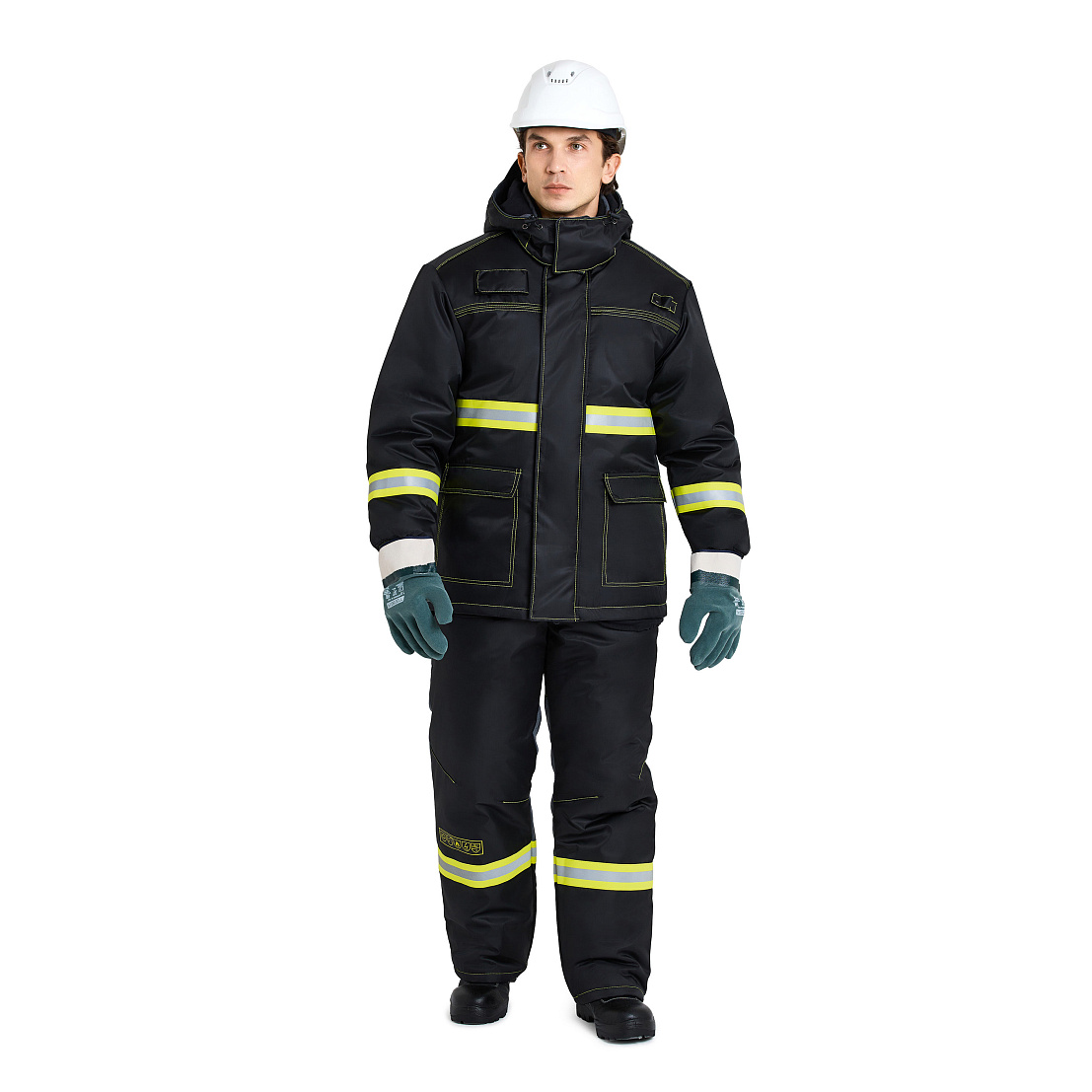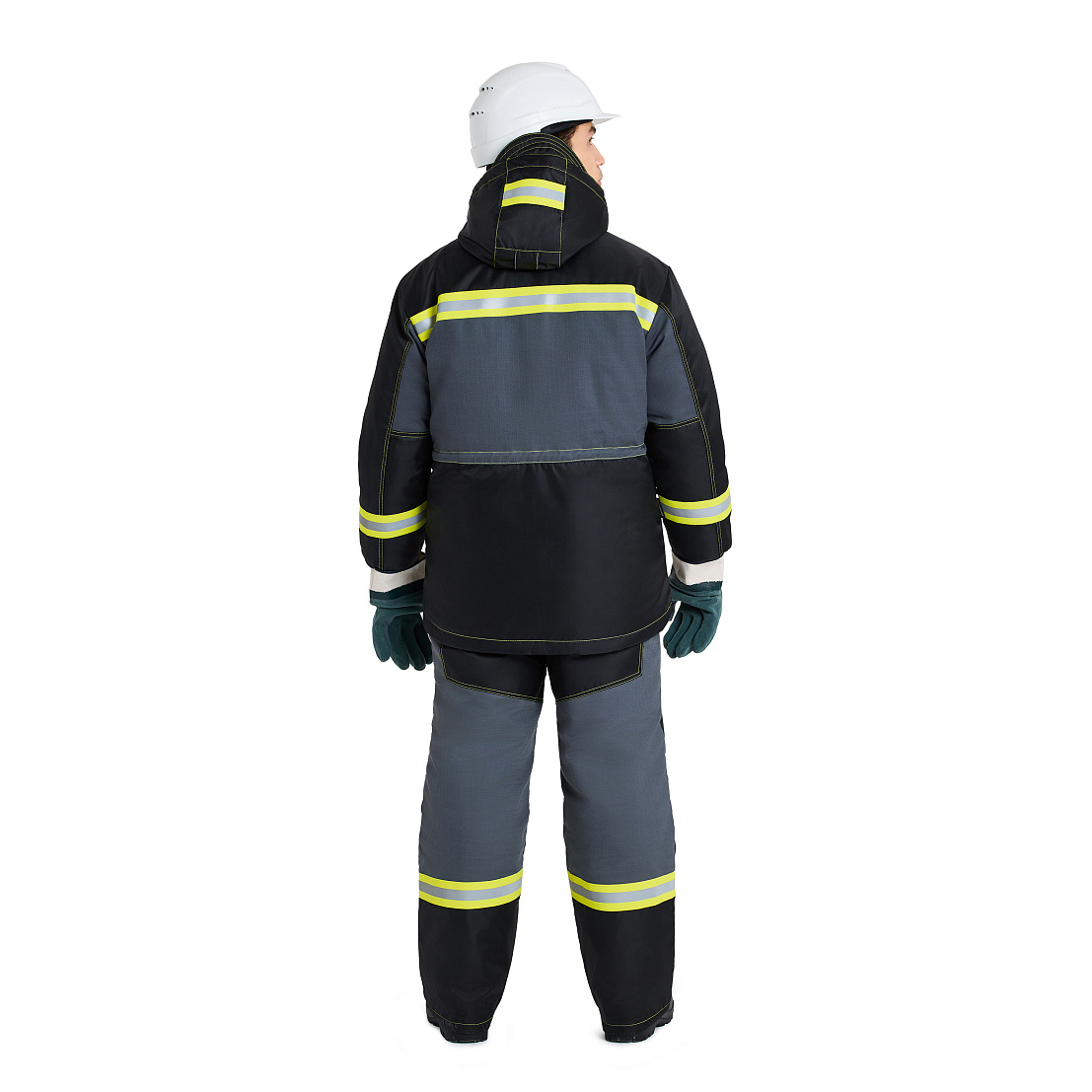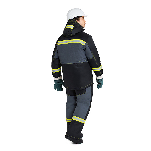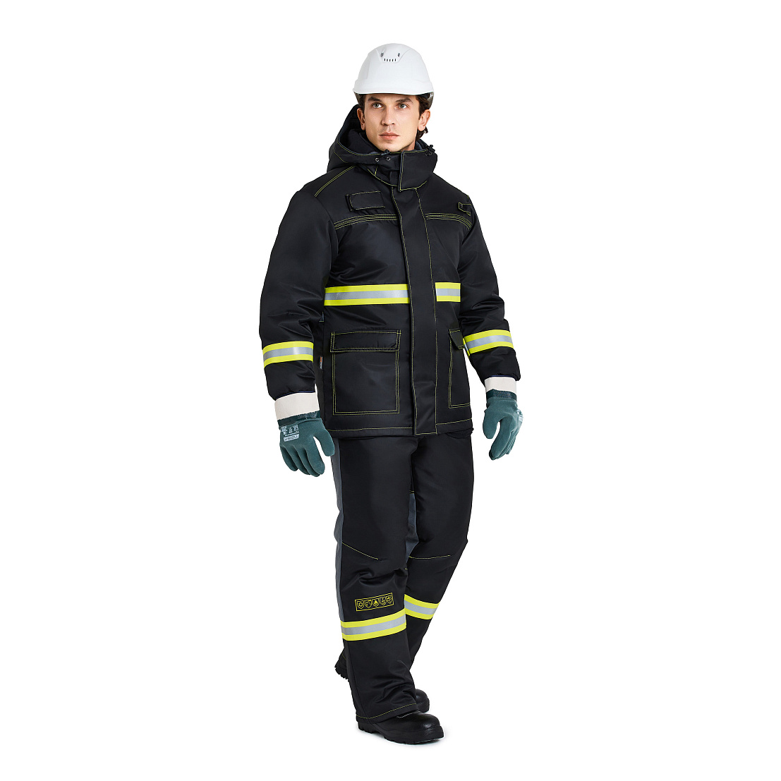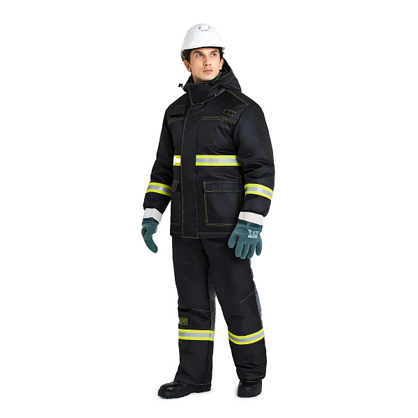 Изделие предназначено для защиты от пониженных температур воздуха при эксплуатации в IV и «особом» климатических поясах, 2-го кл. защиты от сырой нефти и нефтепродуктов, кратковременного воздействия открытого пламени и статического электричества. Костюм серо-черного цвета состоит из куртки и брюк, изготовленных из легкой огнестойкой антистатической ткани с нефтемасловодоотталкивающей, кислотостойкой (К50) отделкой и высокими разрывными, износостойкими показателями. Накладки на куртке и брюках обеспечивают защиту от загрязнения нефтью и нефтепродуктами, изготовлены из огнестойкой антистатической ткани с PU покрытием. Капюшон с защитной накладкой. Двухцветные серо-лимонные, огнестойкие, световозвращающие полосы придают изделию оригинальный внешний вид